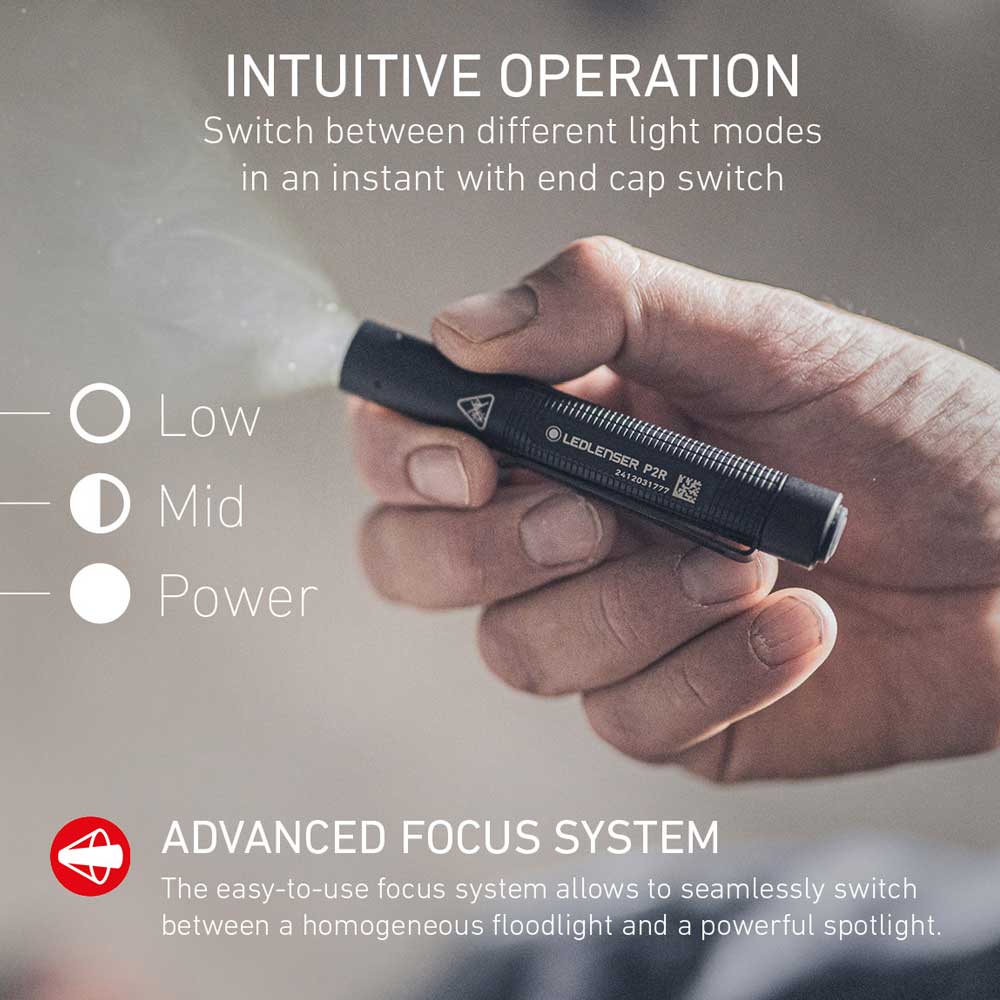 It offers a 200 lumen output on the power setting with a 90 metre beam distance. The P2R includes innovative light focus technology for improved performance and range.